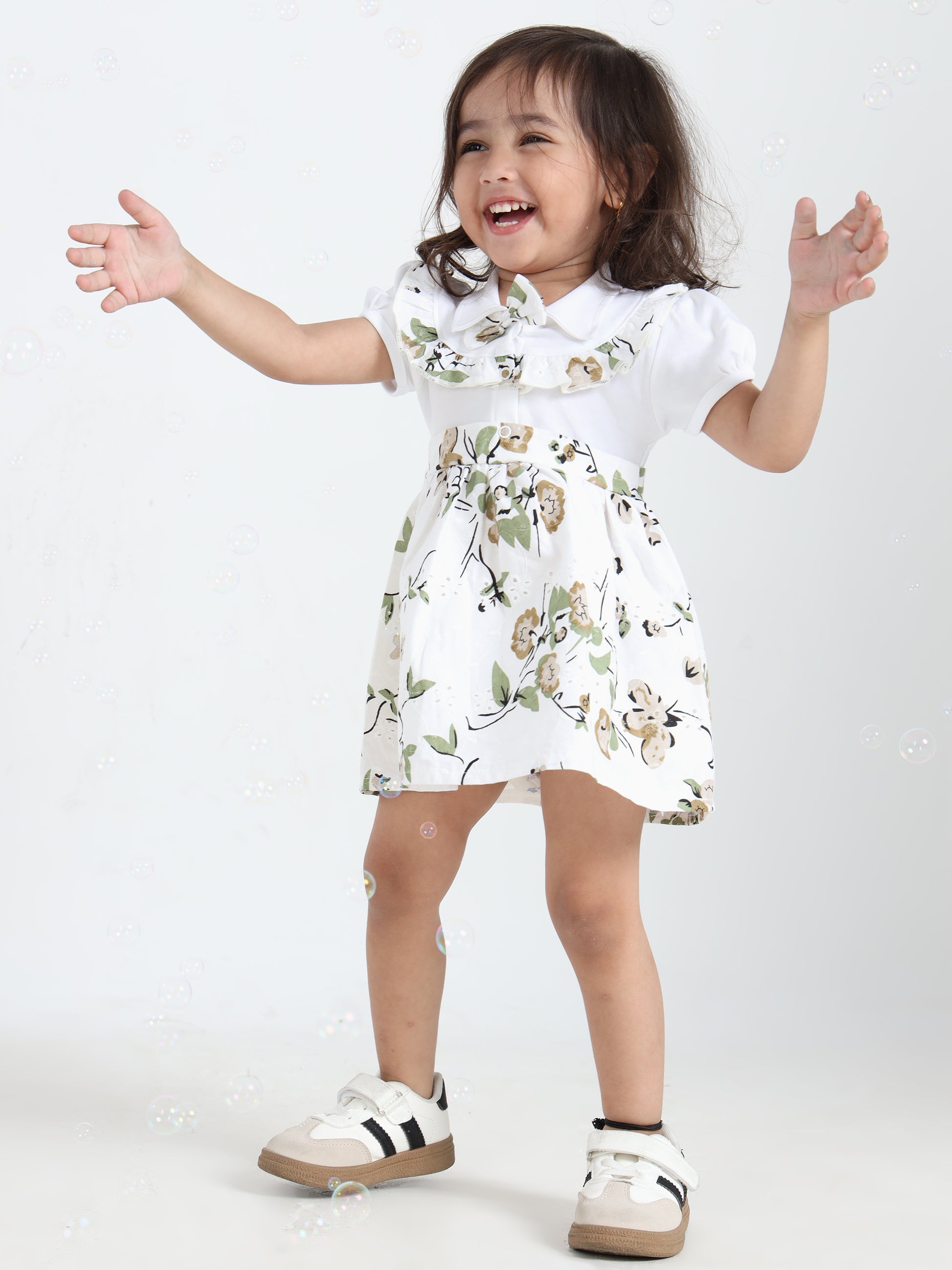 Let your little one bloom in this adorable knee-length frock! Crafted from soft, breathable woven fabric, it offers a comfy regular fit for easy movement. The charming Peter Pan collar adds a sweet vintage touch, while short sleeves keep it light and airy. Adorned with a cheerful floral print, this frock is perfect for playdates, family outings, or special moments. A delightful blend of style and comfort for your little fashionista!